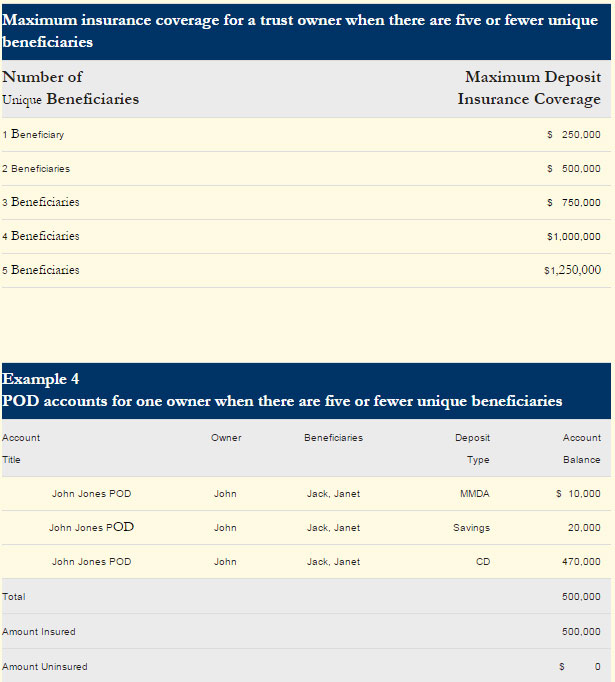 This rule applies to the combined interests of all beneficiaries the owner has named in all formal and informal revocable trust accounts at the same bank. When there are five or fewer beneficiaries, maximum deposit insurance coverage for each trust owner is determined by multiplying $250,000 times the number of unique beneficiaries, regardless of the dollar amount or percentage allotted to each unique beneficiary.