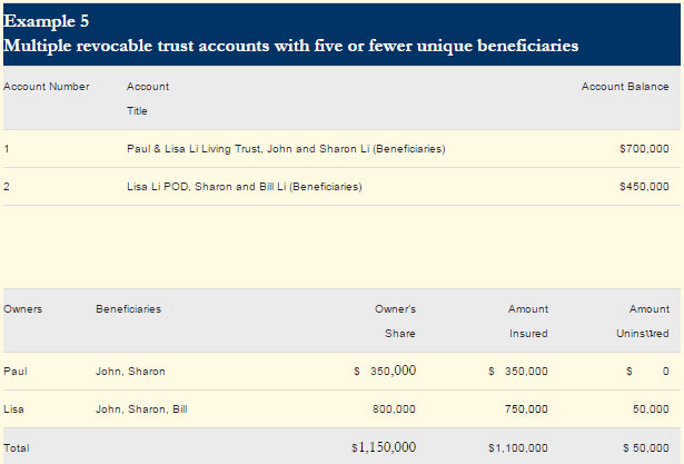 When a revocable trust owner names five or fewer beneficiaries, the owner’s share of each trust account is added together and the owner receives up to $250,000 in insurance coverage for each unique beneficiary.